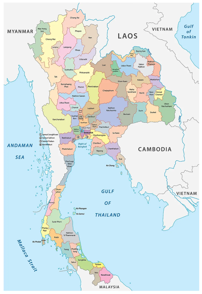 Thailand (officially, Kingdom of Thailand) is divided into 76 administrative provinces. These provinces are further subdivided into districts and smaller subdivisions. There are two specially governed districts – Bangkok and Pattaya.